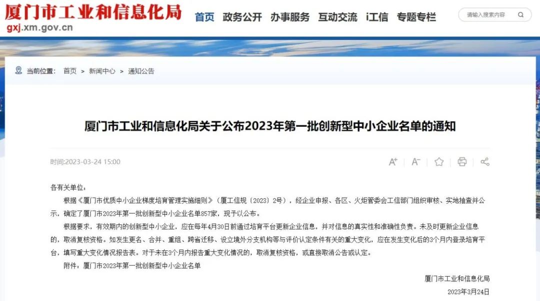 3月24日,廈門市工業(yè)和信息化局公布本年度第一批創(chuàng)新型中小企業(yè)名單,我公司成功入選。