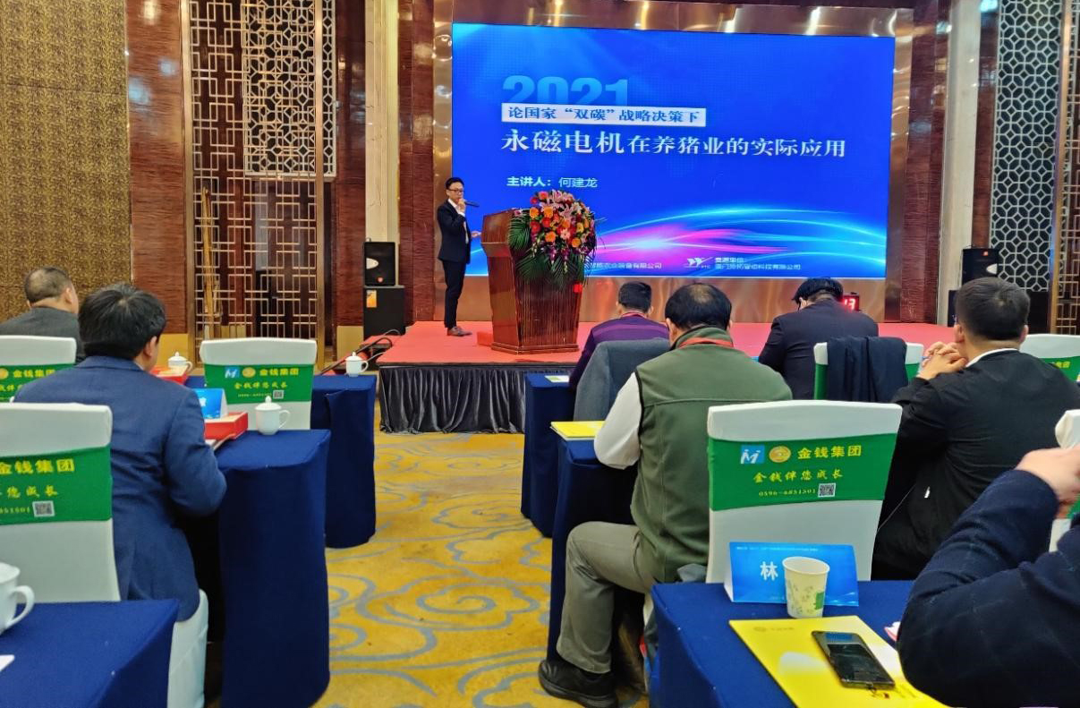2021年12月29日至30日,“『豬場之旅』2021行:生豬產(chǎn)業(yè)高質(zhì)量發(fā)展巡回報(bào)告會(huì)”收官盛典在福建省三明市沙縣區(qū)君華大酒店隆重舉行。廈門勢拓智動(dòng)科技有限公司總經(jīng)理李宓貞和市場部總監(jiān)何建龍等一行人出席此次報(bào)告會(huì)。會(huì)上,何建龍總監(jiān)為與會(huì)聽眾帶來了一場名為“國家‘雙碳’戰(zhàn)略決策下永磁電機(jī)在養(yǎng)豬業(yè)的實(shí)際應(yīng)用”的精彩報(bào)告,詳細(xì)介紹了永磁電機(jī)如何助力畜牧業(yè)碳減排,為國家實(shí)現(xiàn)雙碳目標(biāo)做貢獻(xiàn)。